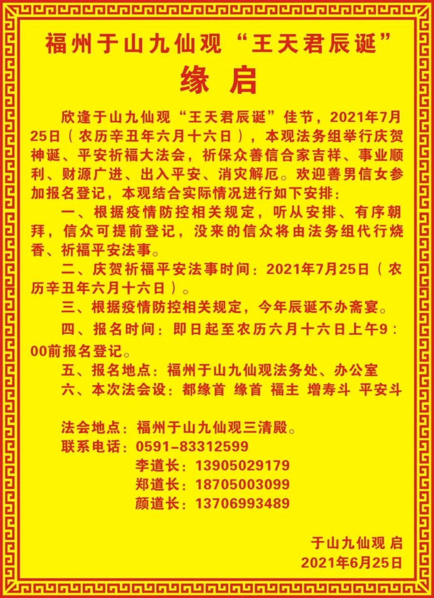 福州于山九仙观“王天君辰诞”法会缘启通知福州于山九仙观“王天君辰诞” 缘 启 欣逢于山九仙观“王天君辰诞”佳节,2021年7月25日(农历辛丑年六月十六日),本观法务组举行庆贺神诞、平安祈福大法会,祈保众善信合家吉祥、事业顺利、财源广进、出入平安、消灾解厄。欢迎善男信女参加报名登记,本观结合实际情况进行如下安排: 于山九仙观 启 |